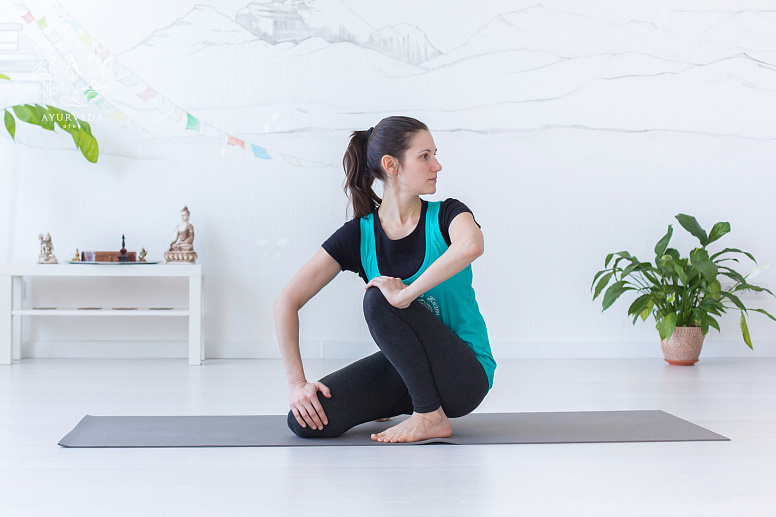 Third step — while holding your breath, press your hand only on the right thigh to activate the right rectus abdominis muscle (Dakshina Nauli). Then repeat the process on the left side (Vama Nauli).